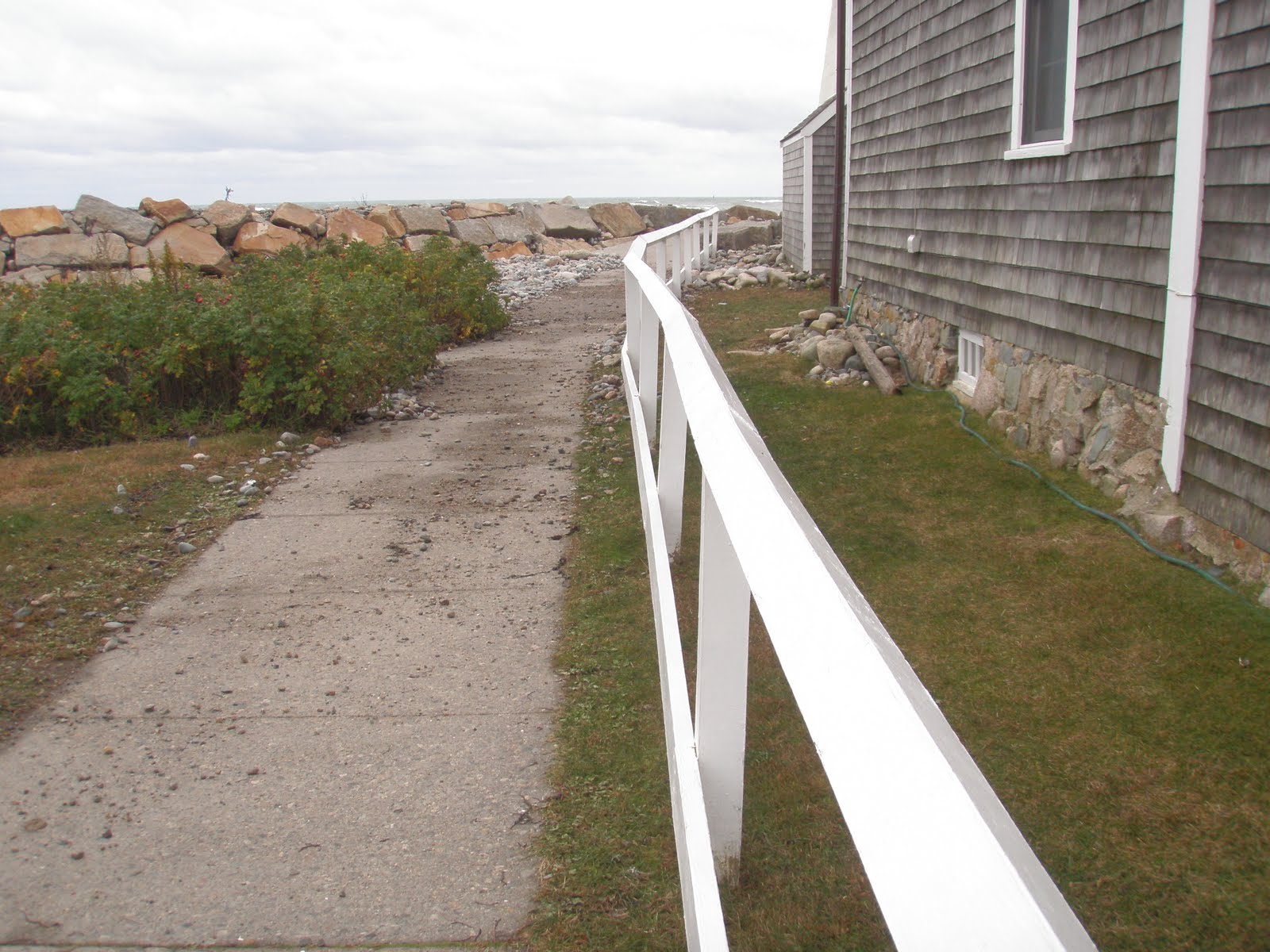 Since arriving in February I have been asked three or four times a week if there have been any big storms out here on the Point. As of today I can answer in the affirmative. A surging tide washed up along the walkway (pictured left) and even into the front yard on the harbor side. Haley captured the 45 minutes or so of the biggest push.