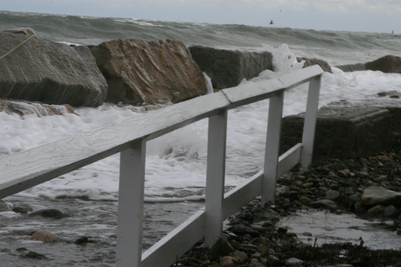 Haley, her friend Kristen, and I went out after the tide and cleaned up – it didn\’t take long. The Highway Department came along and cleaned up the road so cars could pass safely. There were people out checking out the waves though and when I saw one woman in her late sixties nearly break an ankles negotiating the walkway I had to do something about it.