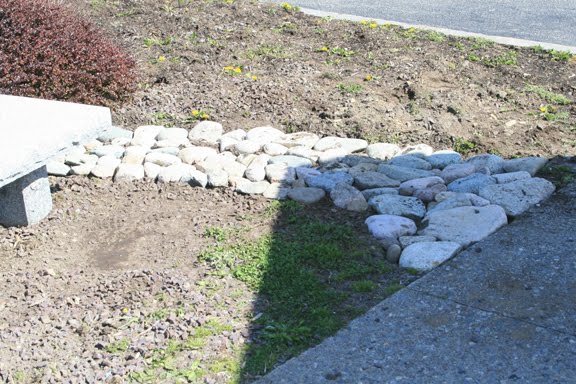 Last week was the April School vacation and I worked with the surrounding stones to remodel the bench area dedicated to long time Cedar Point resident Joan Francis. Weeds and hard pan had replaced a purple stone surrounding the bench and I dug it out over the course of four days, replacing it with beach stone and pieces of granite thrown up into the yard over the winter. Two pictures below tell the story.