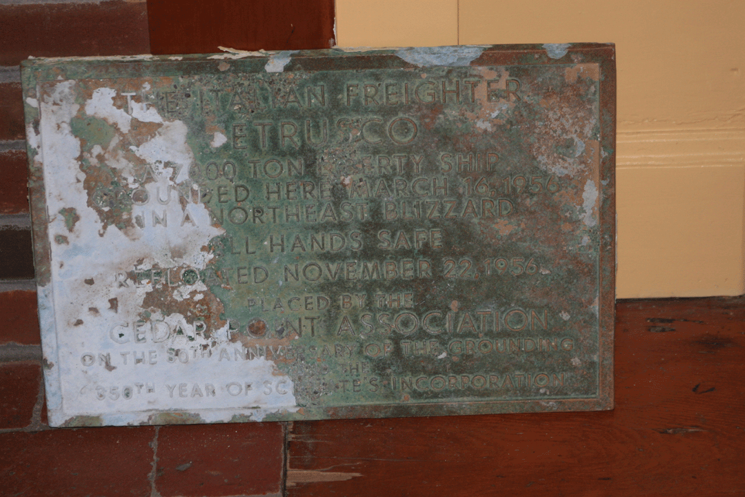 One of the stories yet to be told of the Boxing Day Blizzard was the discovery of a plaque thought lost for nearly 25 years. In 1986 The Cedar Point Association placed a plaque on the Tower commemorating 30th anniversary of the Grounding of Etrusco. A short time later the bronze sign was noted as gone from the Tower and vandalism was suggested. In the aftermath of the clean up in late December the missing plaque was discovered and turned in to the Scituate Police by a high school student named Brett Concannon. It was weather beaten and caked with sand when discovered. I cleaned it up some and it sits behind me as I type. Shortly it will make its way to the Maritime and Mossing Museum to join the other artifacts dedicated to that shipwreck. Call it the silver (or bronze) lining to what was otherwise a terrible storm.