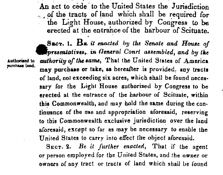 On February 21,1811 The Congress of the United States of America approved a bill authorizing the Secretary of the Treasury to take no more than 6 acres of land to build a Lighthouse at Cedar Point, Scituate. I was working with some documents today when I came across that citation and noted the date. That wasn\’t the day the whole ball got rolling but it must have been some sweet satisfaction for the petitioners who had lobbied Congress for a Light. They would not have heard the news for at least a week but surely there was a great sense of anticipation and pleasure when they heard.
