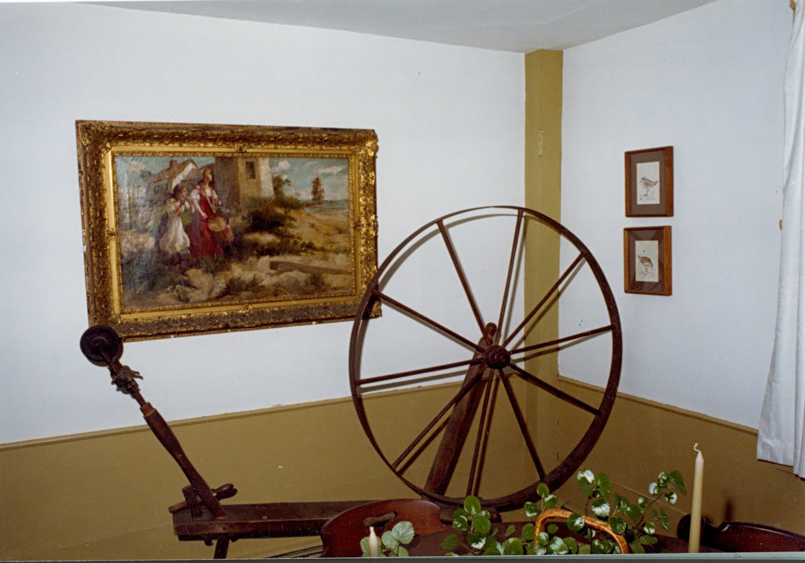 This image is the room I am working in as I type. The painting remains here but is on a different wall. The spinning wheel is no longer part of the setting. I can tell it is this room by the notch in the corner beam.