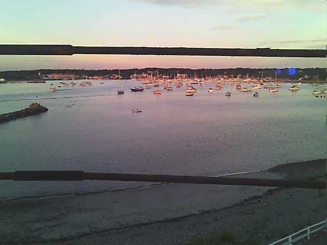 This is a web cam shot taken at 6:00 am as the sun comes up and bathes the boats at the moorings in a soft coral light. The next is from the same camera at 8:30 at night. The bright glow on the right is the Yacht Club.