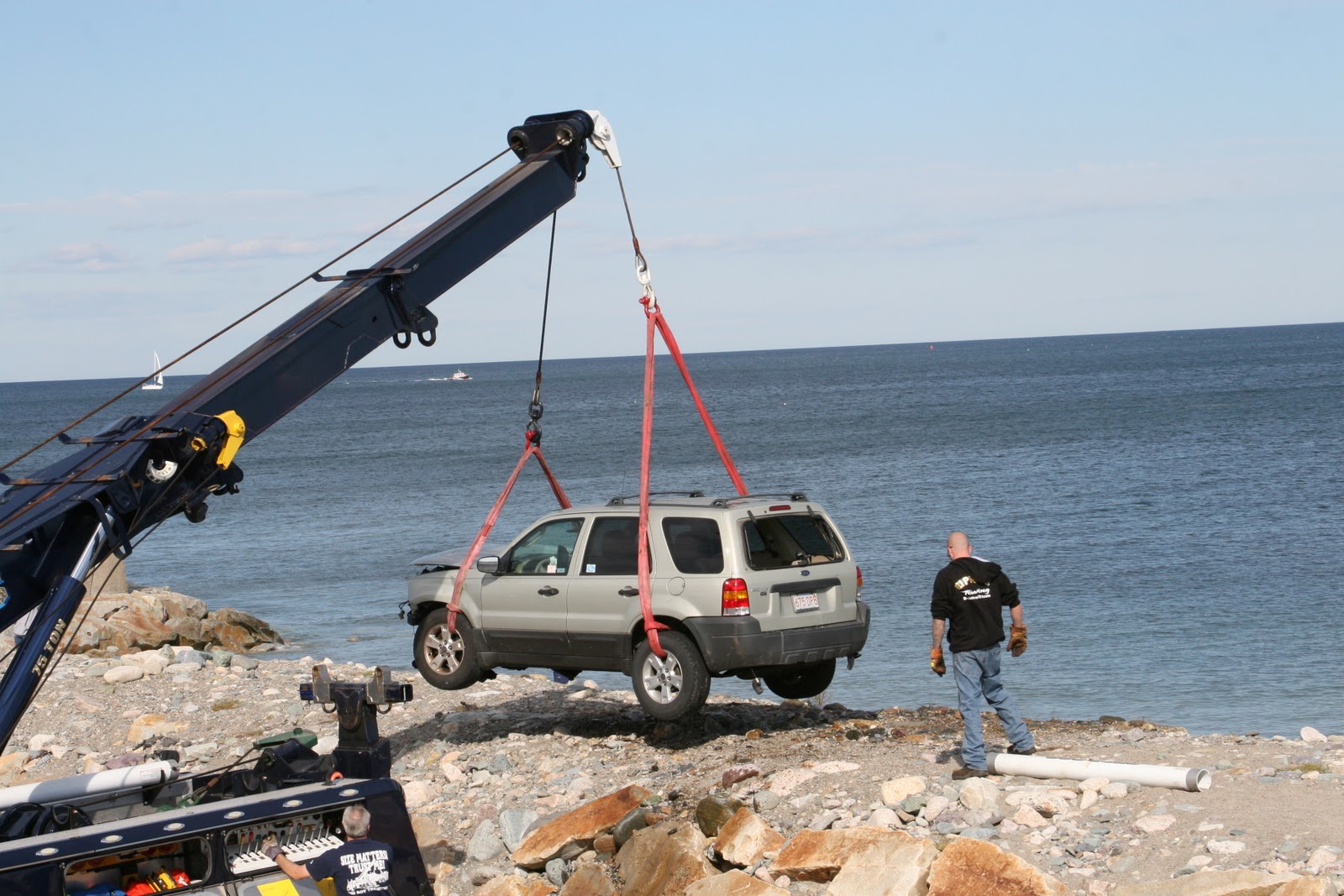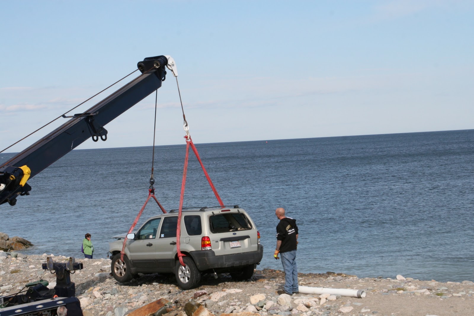 Having decided that the first flat bed truck sent to remove the car would not be adequate, those in charge shifted to the heavy lifters.  Here you can see them rigging the car.