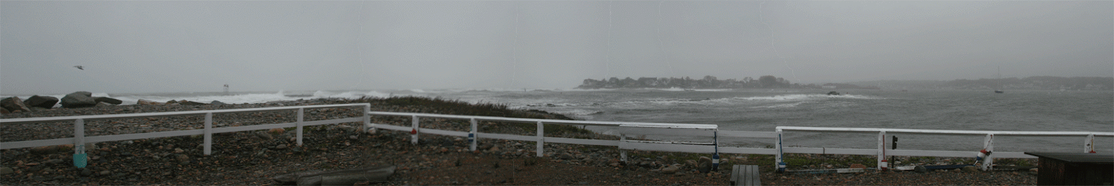 This second one is a composite of the Harbor at around 10:30 this morning. You will want to click on it to enlarge it.  The small jetty was awash 90 minutes before the tide.  In 1991 the capstone to the jetty was washed away and I watched all morning thinking it might happen again.
