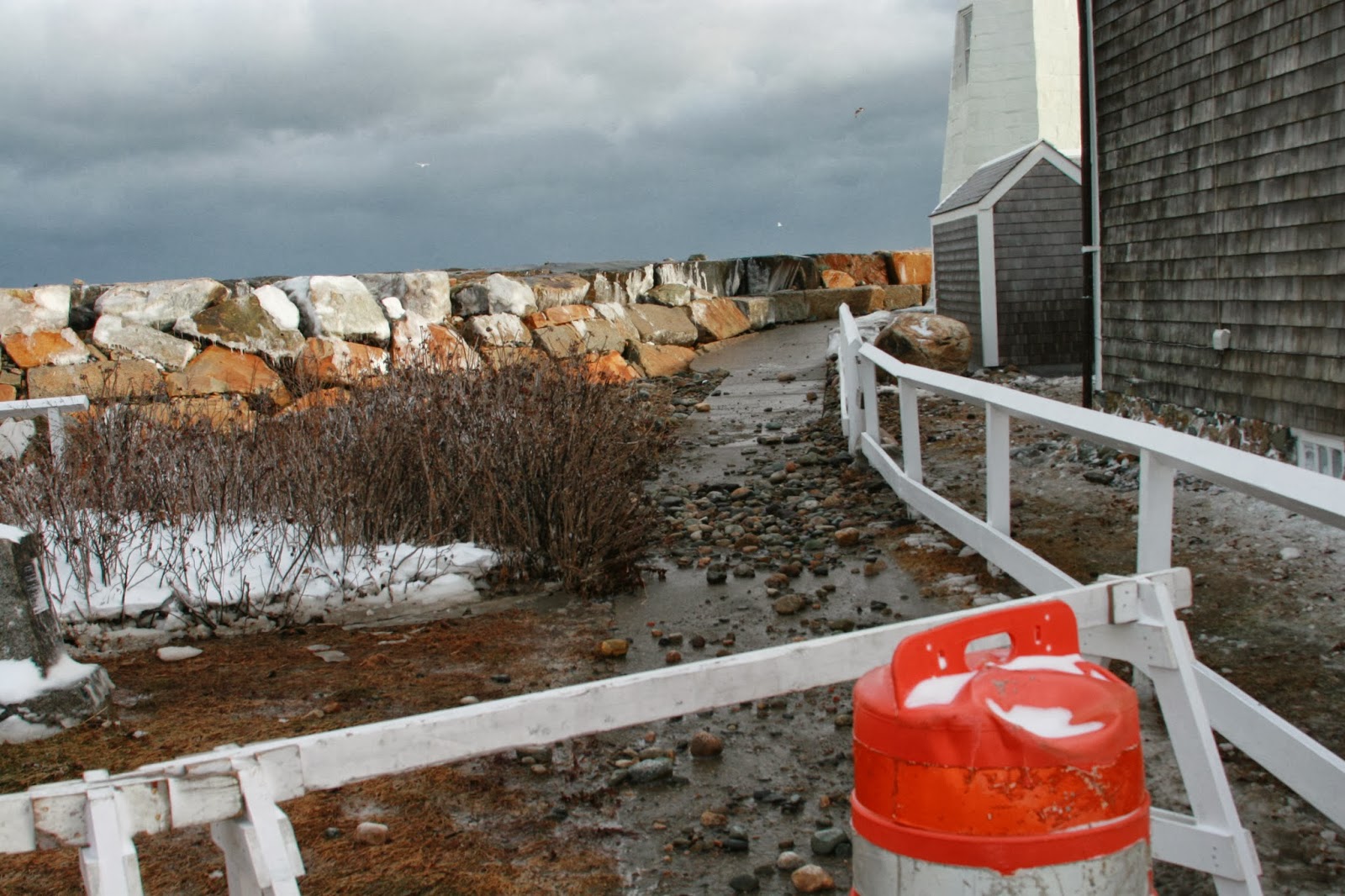 I will let the pictures tell the story with this qualifier: The new wall protected the Lighthouse beautifully. This was a tremendously high tide, nearly 14 feet, and with all that water, there was none of the debris that had commonly pelted the Tower and runway threatening the Cottage. Work all the way through the pictures and there will be two links to videos on You Tube.