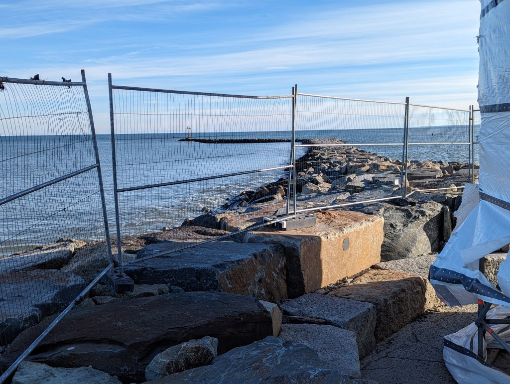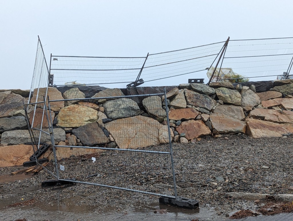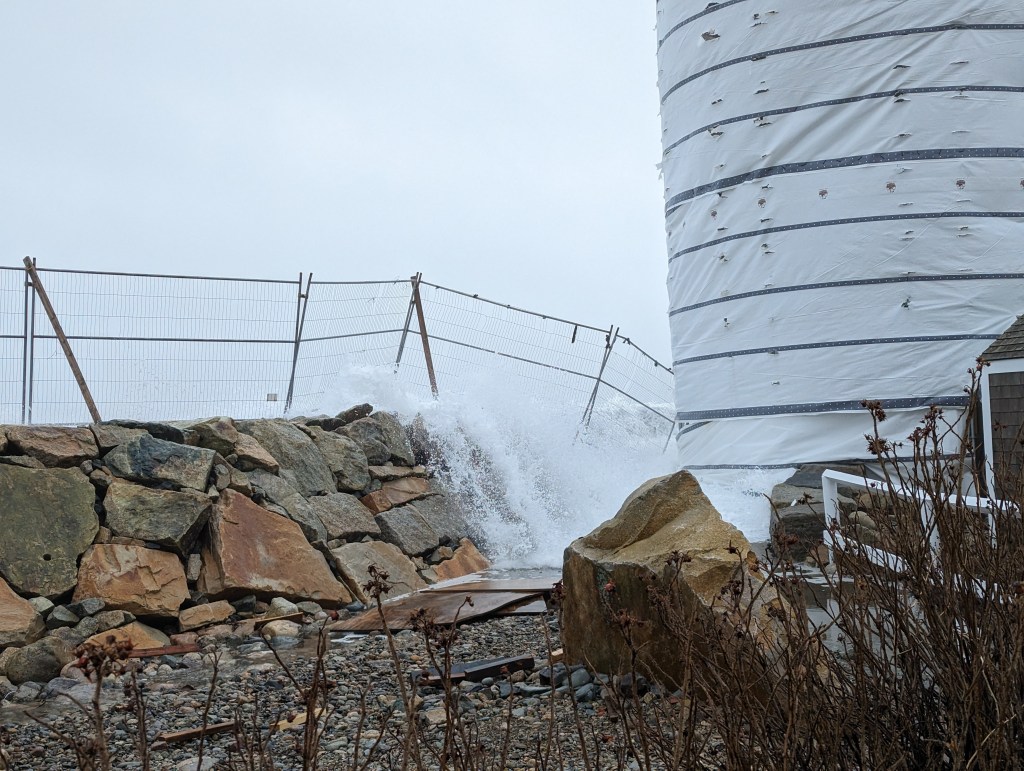 The fences on the parking lot side of things were the first to go. By Friday morning they were down. The fencing in front of the tower let go during the Saturday tide and it was an amazing, resounding clang, as pieces banged off the scaffolding. I was out taking pictures and video of the tide when that brilliant ping was heard. I left them alone until late Saturday when the tide had passed and I was heading around to take a measure of things. They mostly held but for one piece in front of the tower that slipped again overnight Saturday.
