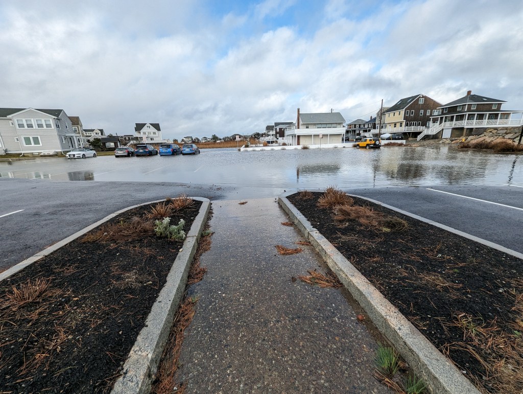 The Town sent a member of the DPW with front end loader and the road got cleaned up. The parking lot was full for some time with water that had no where to go. I saw a police vehicle drive through with water to the lower part of the door. Several neighbors who had parked their cars in the lot to avoid the tide had water rising on their vehicles as well.