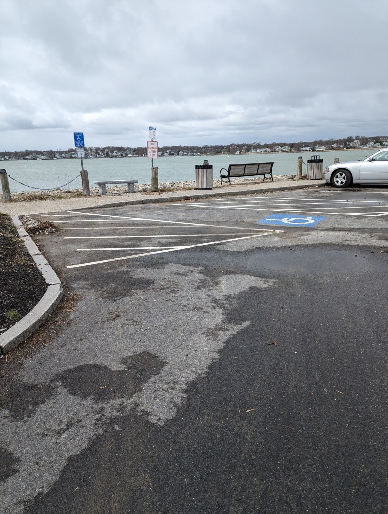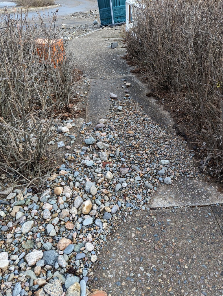 The other handicap spots were cleared to finish the day. I have learned my limits and I called it quits for Saturday. This morning I took on the big island out by the revetment, raked out the rocks, and scooped up all the debris in a big chunk of the road. The tide started splashing over again which left some roadway remaining to be swept up. I will take another run at it after school tomorrow.