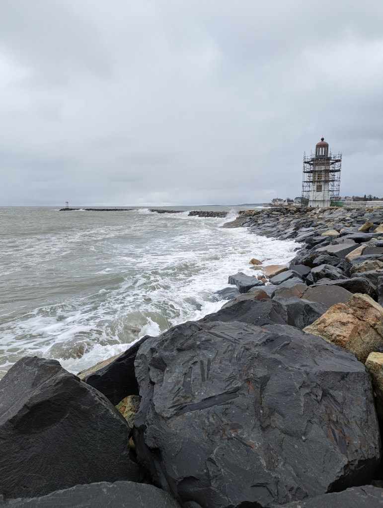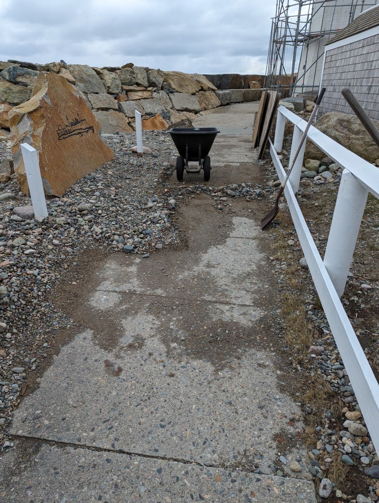I made a start on Friday afternoon. The walkway on the ocean side was cleared to a point beyond which I knew I would need the wheelbarrow. The walk by the flag pole island got enough attention that you could pass without breaking an ankle. Cleaning that up I got a good look at the beach and the new angle created by the tide. There will need to be a good deal of rearranging before the boardwalk can go back in place. The slope is severe right now and no amount of shims is going to bring the walk back to level. The beach is also quite narrow. In one 18 foot stretch it has narrowed to only 4 feet and I need 5.5. The tide also scoured a spot up by the tower. This is will likely mean I need to wait until the project is complete before having the path leveled for the walk. Anyone doing the service will need to get into the yard and that won’t happen until the restoration is wrapped up. I am told work will begin again on April 22. I was glad I had stacked up a big pile of lumber on a rack that had been used as a work bench. All of that lumber would have been in the harbor otherwise. The rack itself was shifted by wave action.