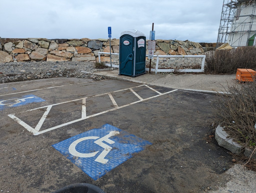 The handicap spots were made accessible once again. The porta potty remains. It was off the sidewalk and listing when I went out and was made secure against the fence. I was grateful it had not tipped over as another one nearby had. The fence itself has become in need of attention. I pinned in the top post but there is a great deal of rot evident. With another tide on the way Wednesday into Thursday we can see what kind of a ride these pieces go on next.