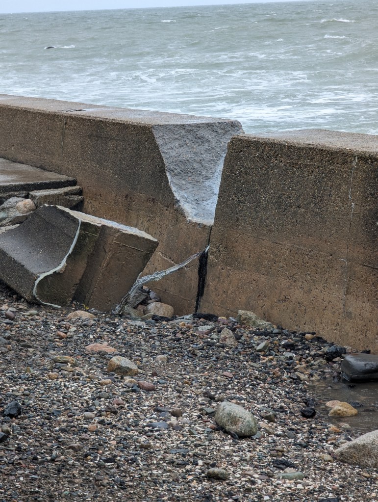 This breech is roughly 75 yards from this keyboard. The odd thing about it is the lack of rebar folded into the concrete. There is another similar breech from this tide on Oceanside Drive at the bottom of Wampatuck Ave. These were not walls that were suspect in any way. Now they are.