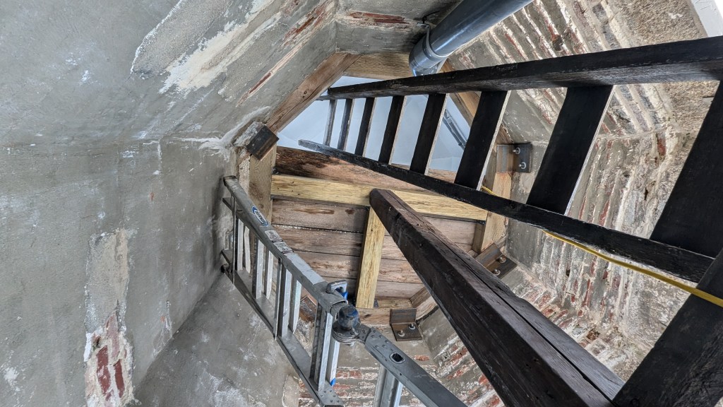 The bracing you can see was painted battleship grey and the bolts will serve perfectly for the scavenger hunt sign that has been a fixture of the tower in the past.
