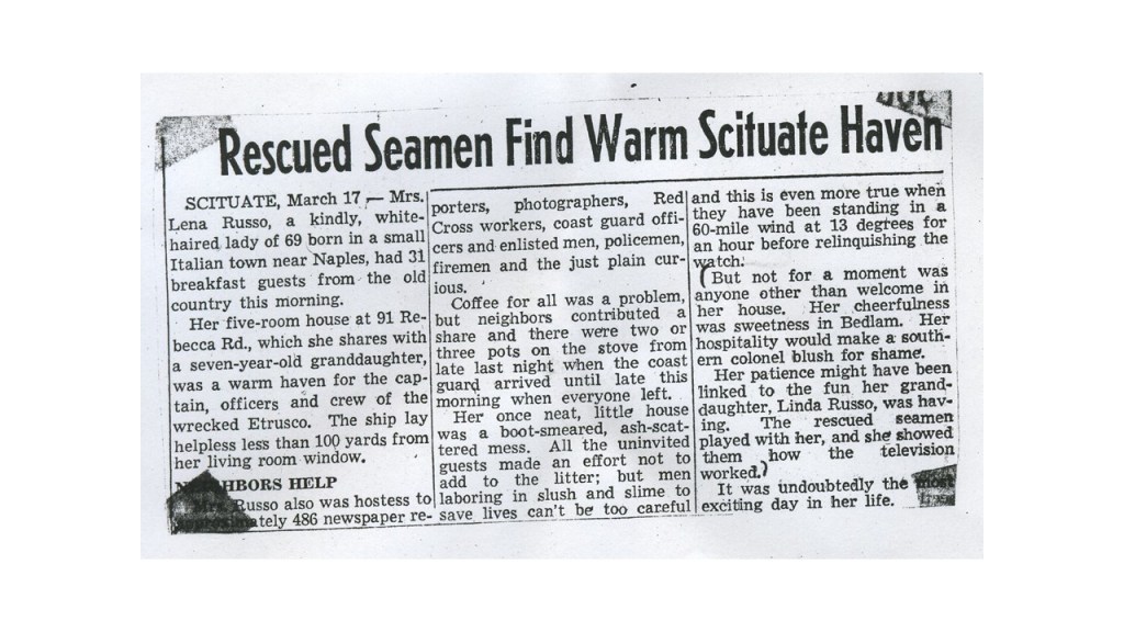 Etrusco lacked any cargo, was in ballast. Control of the ship was lost to the waves and the wind. A certain worry was that the ship could capsize. Communications were lost with the Coast Guard and only restored by the quick action of the Scituate Civil Defense Group. Wayne Kestilla forced his way through waist deep drifts to reach First Cliff and jury rig power with the old trick of aluminum foil added to a spent fuse. Mrs. Russo’s house must have been the greatest relief to these lost sailors after hours of anxiety.